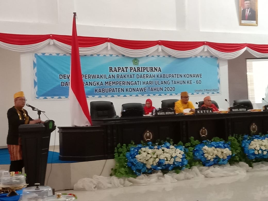 Sambutan Bupati Konawe yang dibacakan Wakil Bupati Konawe Gusli Topan Sabara pada rapat paripurna DPRD dalam rangka HUT Konawe ke-60.
