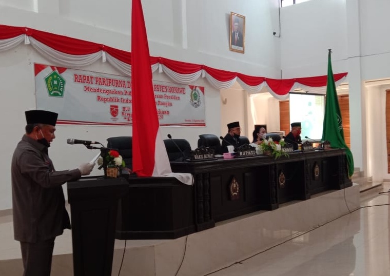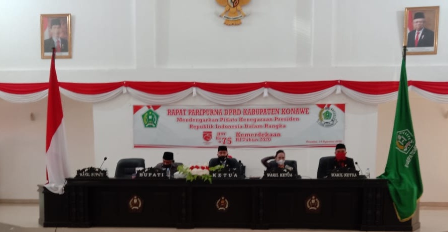 UNAAHA. SULTRA HEADLINE.COM. Dewan Perwakilan Rakyat Daerah (DPRD) Kabupaten Konawe, Sulawesi Tenggara (Sultra), Jum’at (14/8/2020) kemarin, menggelar rapat paripurna dengan agenda mendengarkan pidato kenegaraan oleh Presiden RI Joko Widodo dalam rangka HUT ke-75 Kemerdekaan Republik Indonesia.