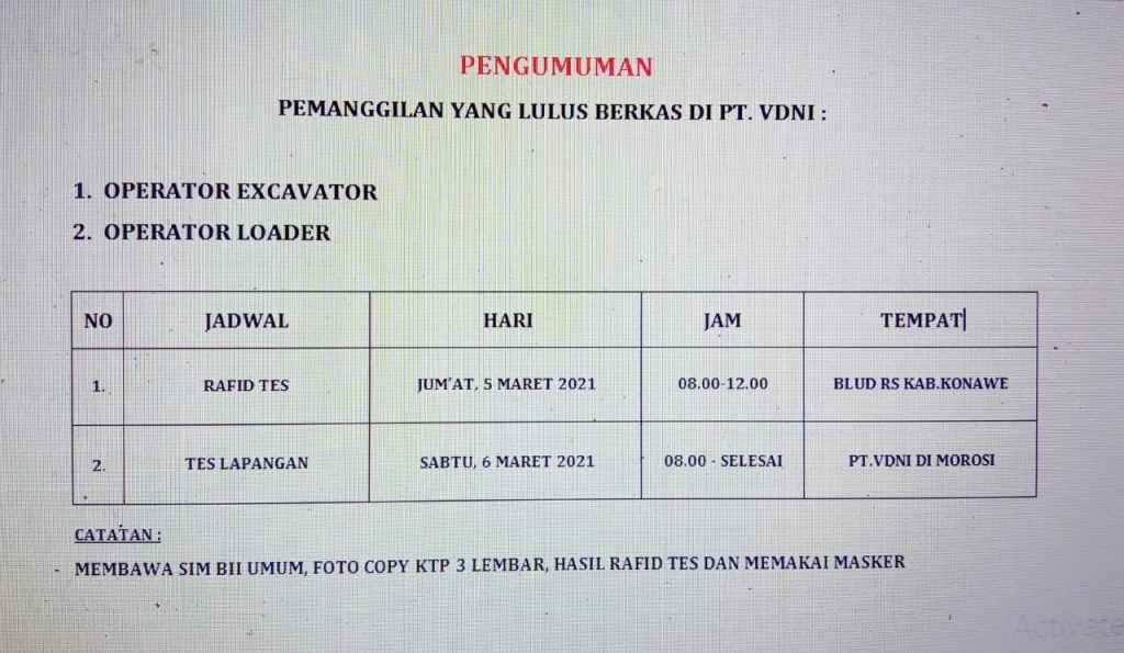 Pengumuman Pemanggilan CTKL Divisi Operator Excavator dan Loader PT VDNI