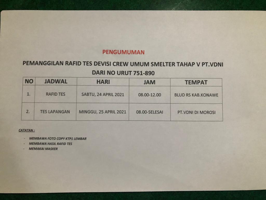 Pengumuman Pemanggilan Divisi Crew Umum Smelter Tahap 5 PT VDNI
