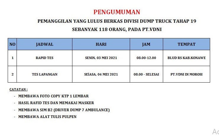 Pengumuman Pemanggilan Divisi Dump Truck Tahap 19 PT VDNI