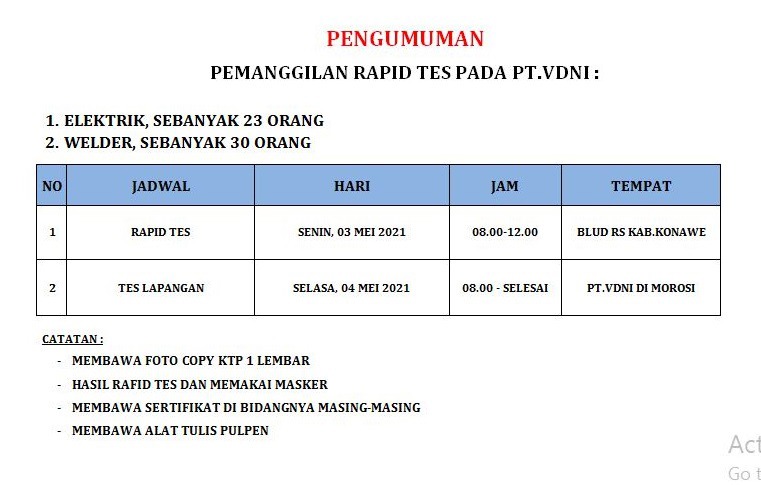 Pengumuman Pemanggilan Divisi Elektrik dan Divisi Welder PT VDNI