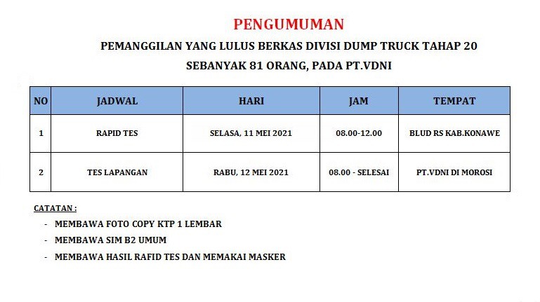 Pengumuman Pemanggilan Divisi Dump Truck Tahap 20 PT VDNI