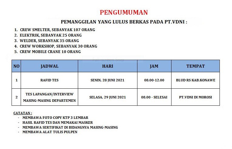 Pengumuman Pemanggilan Lima Divisi PT VDNI