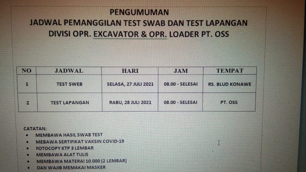 Pengumuman Pemanggilan CTKL Divisi Excavator dan Loader PT OSS
