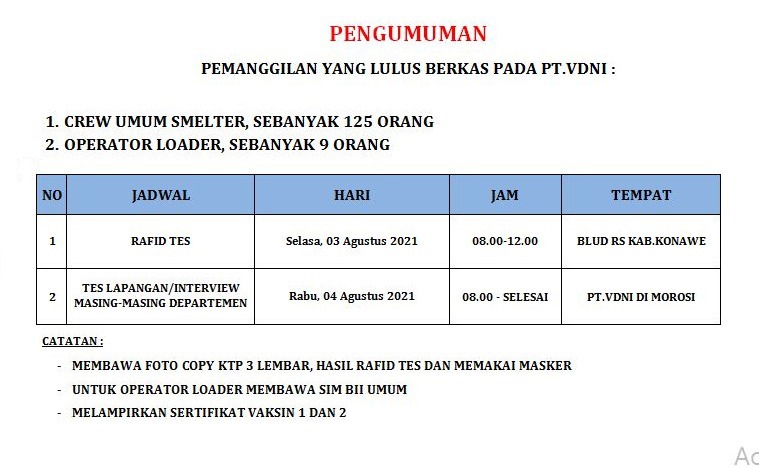 Pengumuman Pemanggilan CTKL Divisi Crew Umum Smelter dan Operator Loader PT VDNI