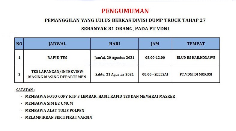 Pengumuman Pemanggilan CTKL Divisi Dump Truck Tahap 27 PT VDNI