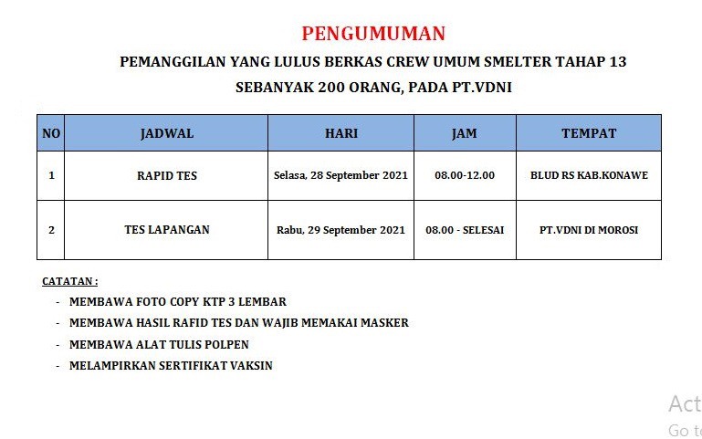Pengumuman Pemanggilan CTKL Divisi Crew Umum Smelter Tahap 13 PT VDNI