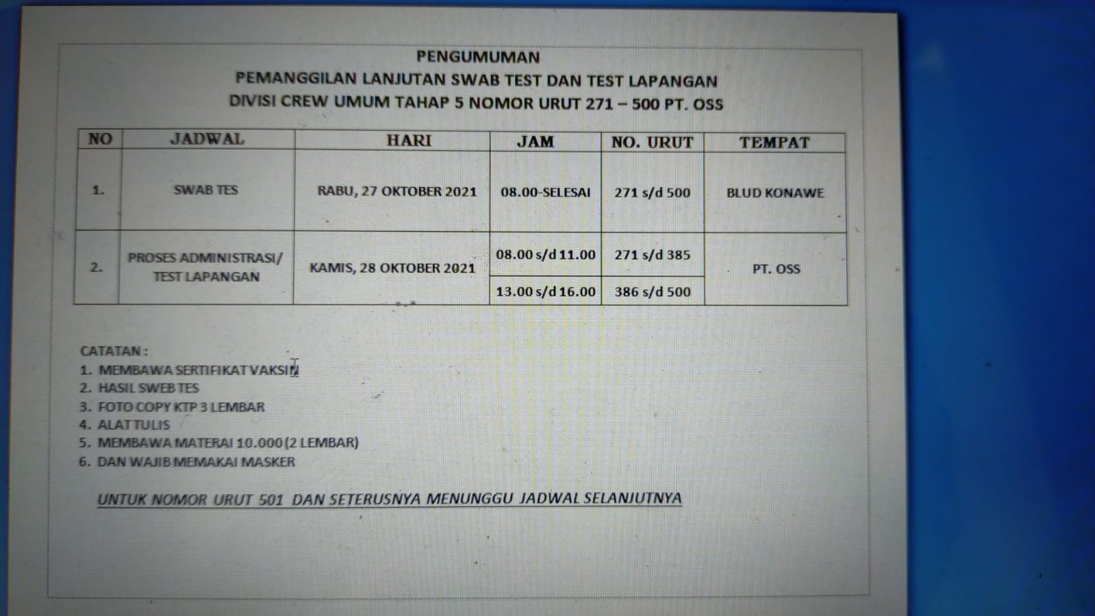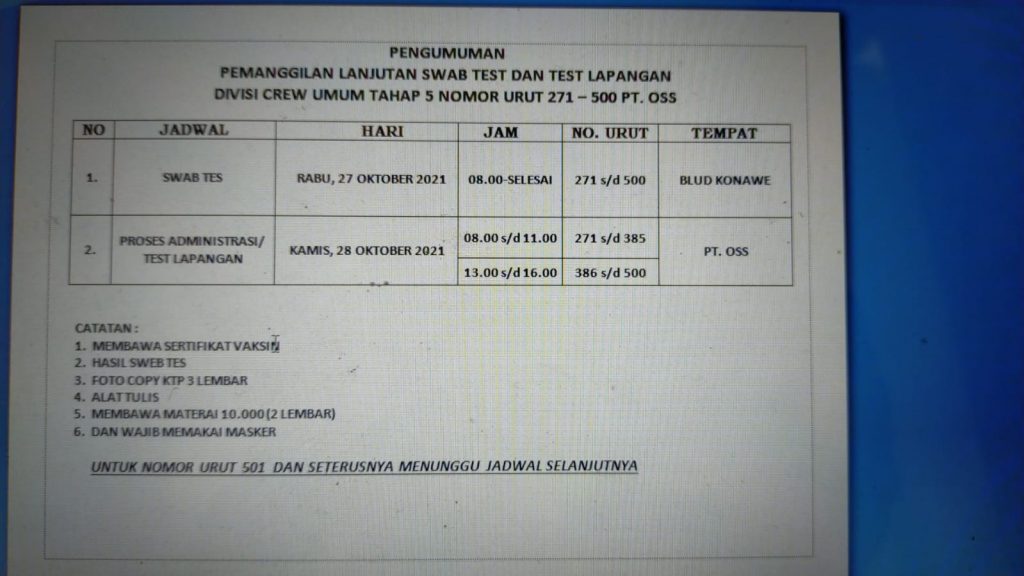 Pengumuman Pemanggilan Divisi Crew Umum Tahap 5 Nomor Urut 271-500 PT OSS