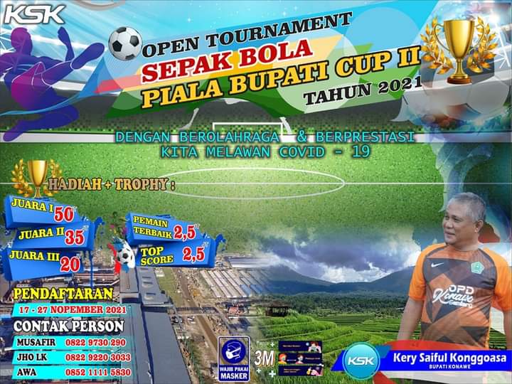 UNAAHA.SULTRAHEADLINE.COM. Pemerintah Kabupaten (Pemkab) Konawe, Sulawesi Tenggara (Sultra), akan menggelar turnamen sepakbola Bupati Cup II 2021, pada turnamen tersebut pihak penyelenggara telah menyediakan hadiah sekira Rp100 juta bagi para pemenang.