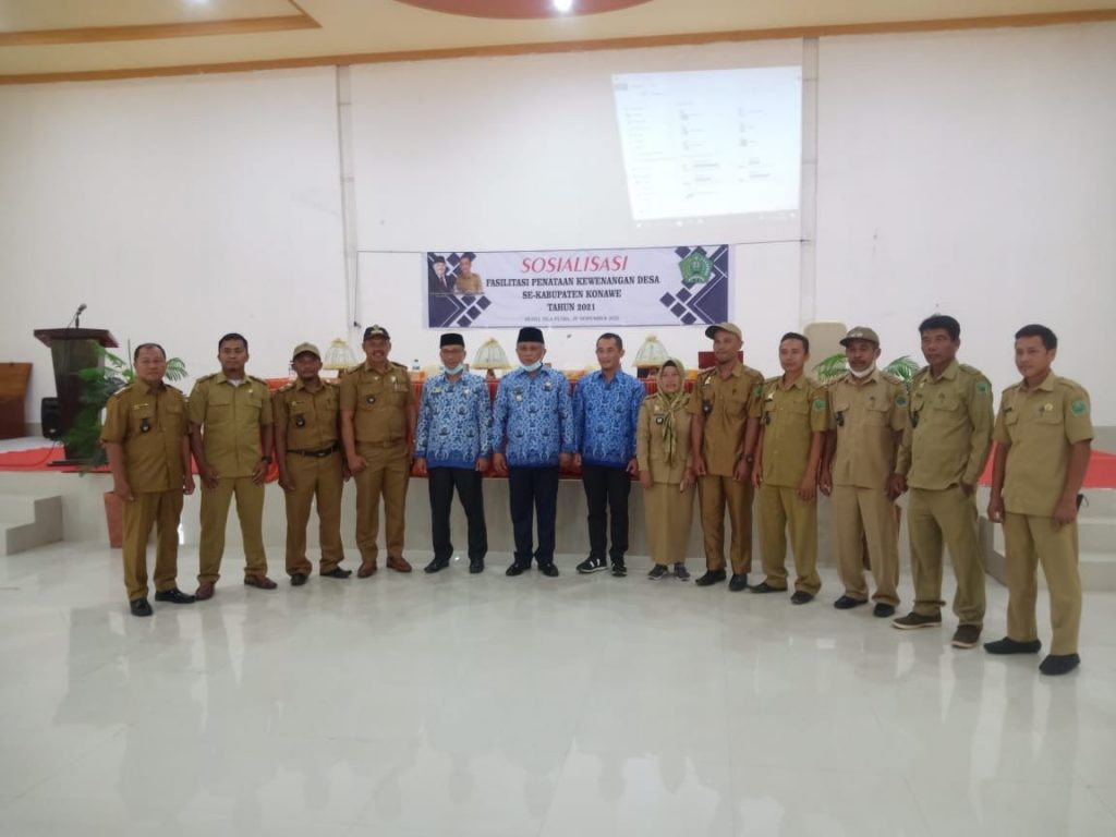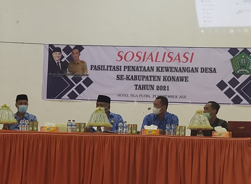 UNAAHA, SULTRA HEADLINE.COM. Badan Pemberdayaan Masyarakat Desa (BPMD) Konawe menggelar sosialisasi pendataan kewenangan desa di salah satu hotel di Unaaha, Senin (29/11/2021). Pesertanya seluruh kepala desa (kades) se-Konawe. Turut hadir Bupati Konawe, Kery Saiful Konggoasa.