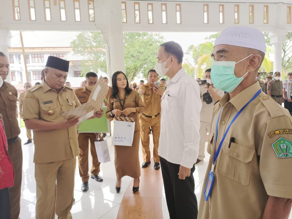 Pejabat yang purnatugas langsung menerima SK pensiun yang diserahkan langsung oleh Bupati Konawe Kery Saiful Konggoasa (KSK) di Pendopo Kantor Bupati Konawe, Senin (30/5/2022).