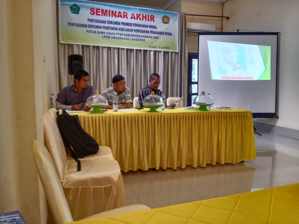 UNAAHA, SULTRA HEADLINE.COM. Dinas Penanaman Modal dan Pelayanan Terpadu Satu Pintu (DPMPTSP) Kabupaten Konawe bekerjasama dengan Lembaga Penelitian dan Pengabdian Masyarakat (LPPM) Kampus Universitas Lakidende (Unilaki) menggelar seminar akhir penyusunan dokumen serta strategi promosi penanaman modal dan penyusunan dokumen penetapan kebijakan kemudahan penanaman modal.