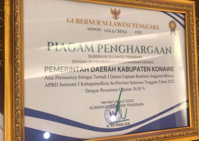 UNAAHA, SULTRAHEADLINE.COM. Kabupaten Konawe, Sulawesi Tenggara (Sultra) meraih peringkat pertama realisasi anggaran pendapatan belanja daerah (APBD) semester I tahun 2022 se-Kabupaten/Kota tertinggi.