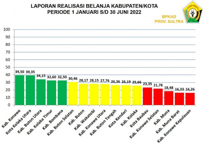 Kabupaten Konawe berhasil menduduki posisi pertama dengan realisasi sebesar 39,35 persen. Disusul posisi kedua Kolaka Utara dengan dan Buton Utara di posisi ketiga.