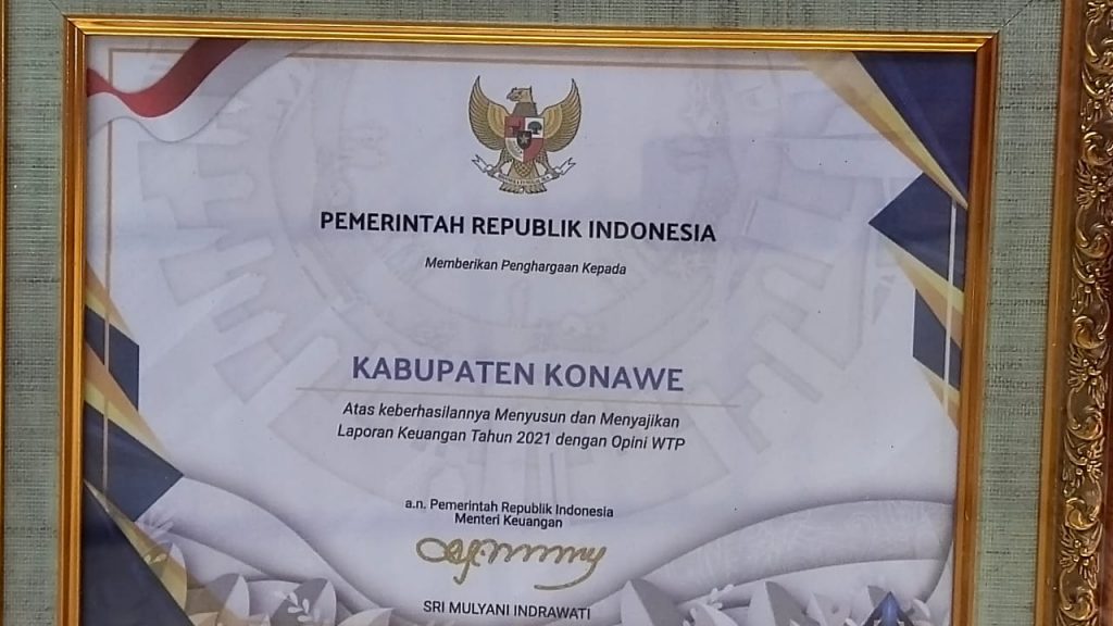 Sementara itu, Kabid Pembinaan Pelaksanaan Anggaran II Kantor Wilayah Direktorat Jenderal Perbendaharaan Sultra, Eko Wahyu Budi Utomo menjelaskan, penghargaan yang diberikan pada Pemkab Konawe berasal dari Kementerian Keuangan RI karena pencapaian opini WTP terhadap laporan keuangan Pemerintah Kabupaten Konawe tahun 2021.