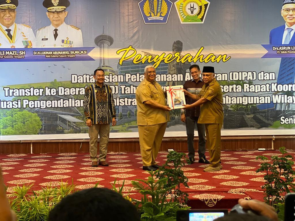 Bupati Konawe Kery Saiful Konggoasa menghadiri kegiatan penyerahan DIPA dan TKD tahun anggaran 2023 serta rapat koordinasi dan evaluasi administrasi pelaksanaan pembangunan wilayah tahun 2022 di hotel zahrah Syariah Kendari, 5 desember 2022