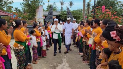 TIRAWUTA, SULTRAHEADLINE. COM. Bupati Kolaka Timur (Koltim) Abd Azis SH MH, menyerahkan bantuan rumah ibadah Pura berupa uang tunai sebesar Rp100 juta, usai menghadiri upacara Piodalan di Pura Adat Amerta Sari, Desa Mekar Jaya, Kecamatan Dangia, Rabu (5/4/2023).