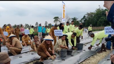 UNAAHA, SULTRA HEADLINE.COM. Penjabat (Pj) Bupati Konawe Harmin Ramba menghadiri acara penanaman cabai serentak di daerah pengembangan tanaman holtikultura di Desa Nario Indah Kecamatan Wawotobi, Selasa (20/2). Usai melakukan penanaman cabai, PJ Bupati juga berkesempatan melakukan panen jagung dan bawang di lokasi tersebut.