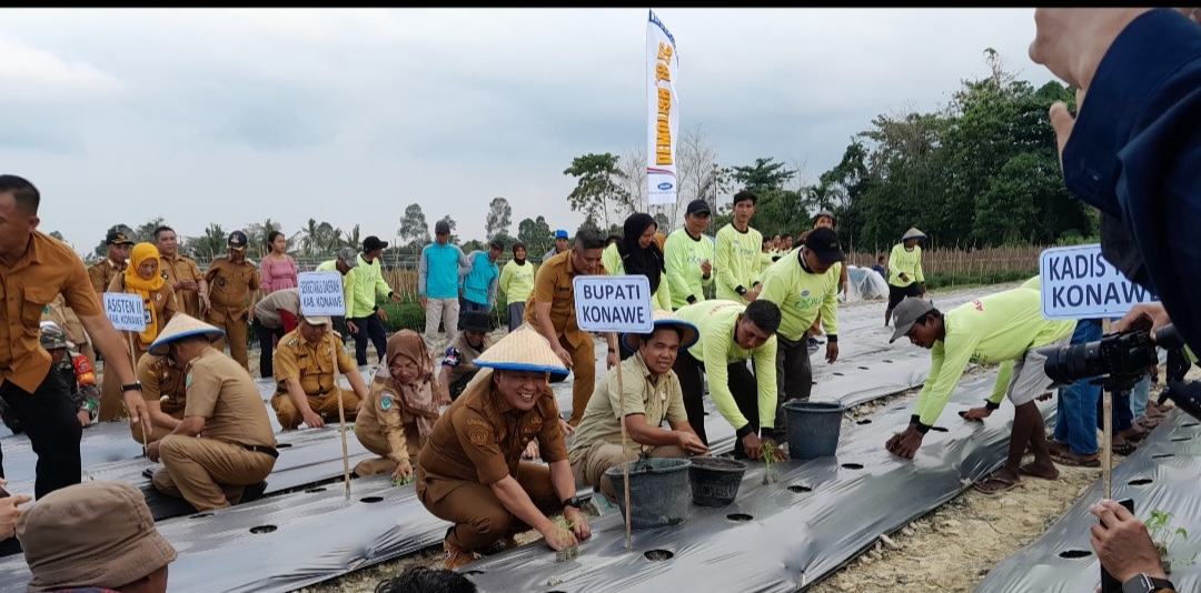 UNAAHA, SULTRA HEADLINE.COM. Penjabat (Pj) Bupati Konawe Harmin Ramba menghadiri acara penanaman cabai serentak di daerah pengembangan tanaman holtikultura di Desa Nario Indah Kecamatan Wawotobi, Selasa (20/2). Usai melakukan penanaman cabai, PJ Bupati juga berkesempatan melakukan panen jagung dan bawang di lokasi tersebut.