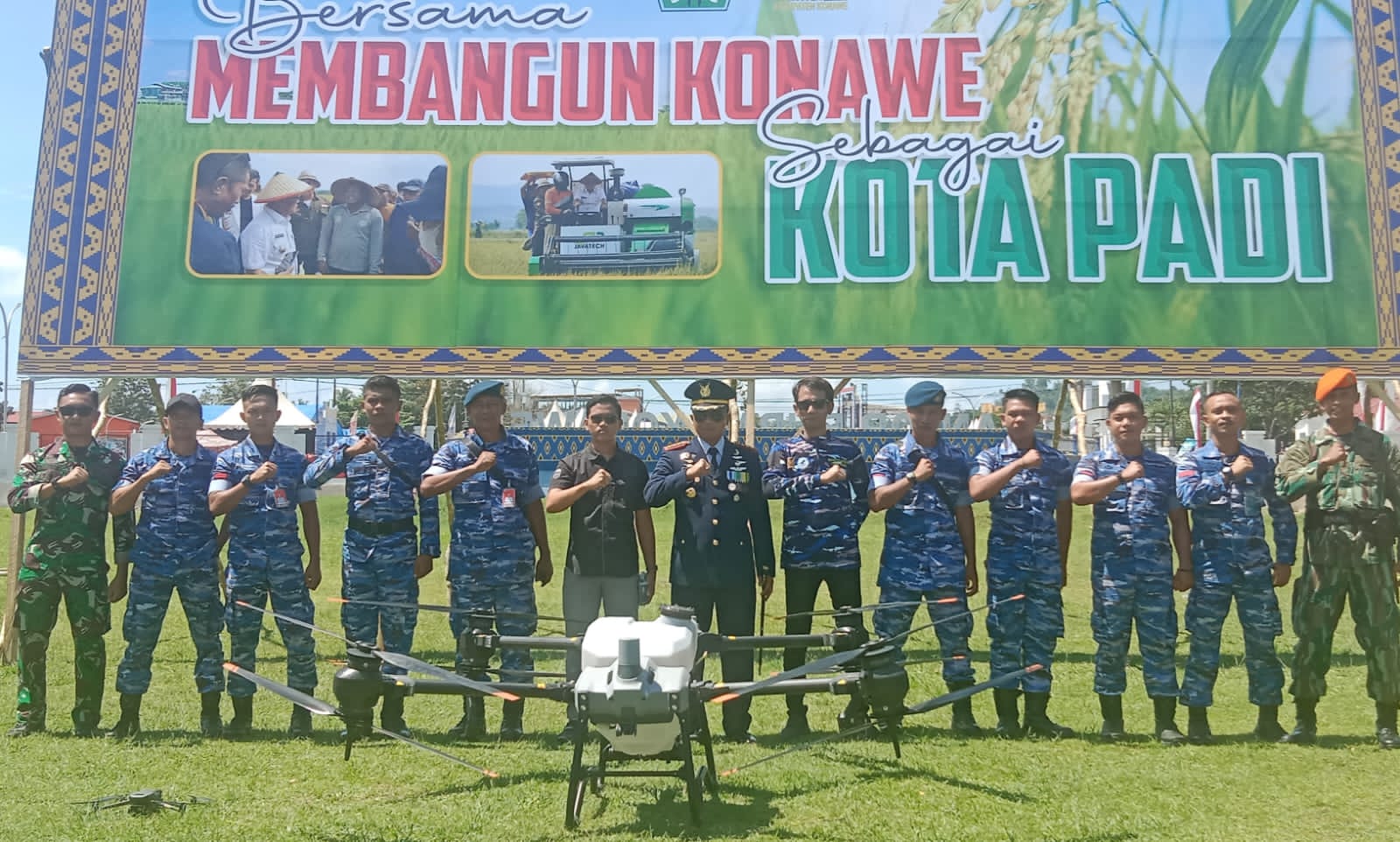 Trainer Instructor Drone Lanut Haluoleo, Edu Dimas mengatakan, TNI AU mempersembahkan Drone T40 penyemprotan untuk mendukung program pertanian Konawe sebagai kota Padi.