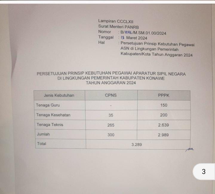 Dalam perekrutan tersebut, Konawe diberi kuota sebanyak 3.289 formasi CPNS dan P3K oleh Kementerian Pendayagunaan Aparatur Negara dan Reformasi Birokrasi (PANRB) RI. Dimana kuota tersebut terdiri dari 300 formasi CPNS dan 2.989 formasi P3K.