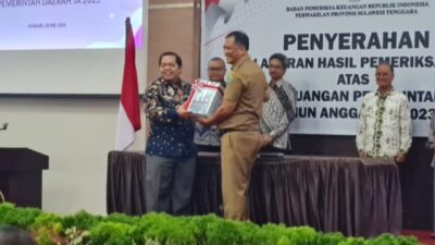Pengumuman raihan WTP itu disampaikan Kepala Perwakilan BPK Sultra, Dadek Nandemar, usai menyerahkan Laporan Hasil Pemeriksaan (LHP) atas Laporan Keuangan Pemerintah Daerah Tahun 2023, yang diterima oleh Sekretaris Daerah (Sekda) Konawe, Ferdinan Sapan, Selasa (28/5/2024).