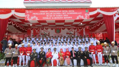 UNAAHA, SULTRAHEADLINE.COM. Peringatan detik-detik Proklamasi Hari Ulang Tahun (HUT) Kemerdekaan Republik Indonesia (RI) ke-79 tahun 2024 dilaksanakan serentak di seluruh Indonesia, termasuk di Kabupaten Konawe yang dipusatkan di pelataran Kantor Bupati, Sabtu (17/08/2024).