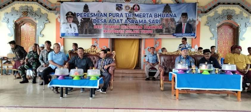 Hal ini disampaikan Plt Bupati Kolaka Timur (Koltim) Abdul Azis SH saat meresmikan Pura Tri Merta Buana Desa Adat Asrama Sari Desa Tasahea Kecamatan Tirawuta, Sabtu (8/10/2022). Turut hadir dalam kegiatan ini, Asisten 2 Setda Koltim Hamsir Majid, anggota DPRD Koltim Ketut Maria Asmara, Ketua WHDI Koltim dan sejumlah pimpinan OPD.